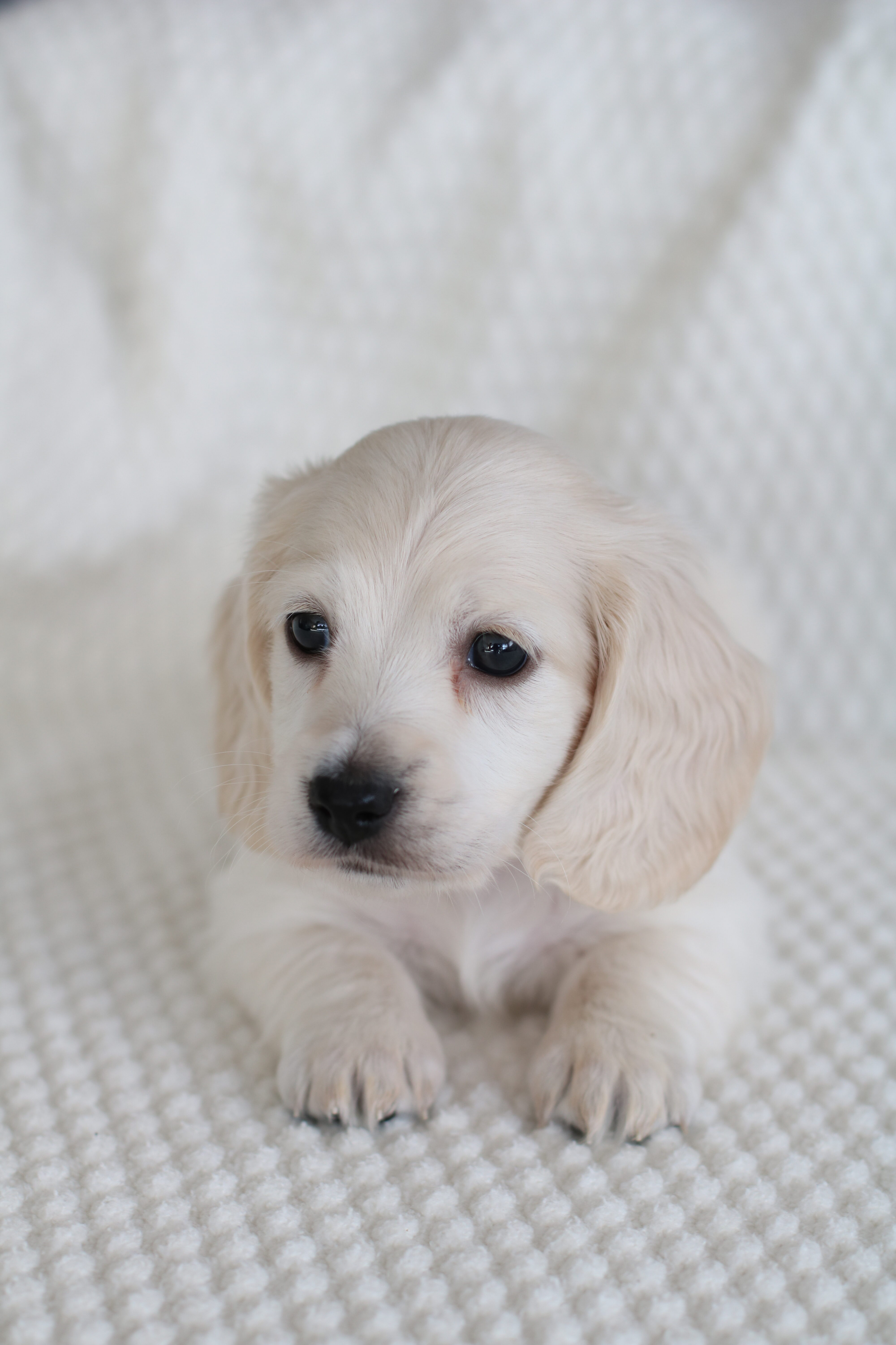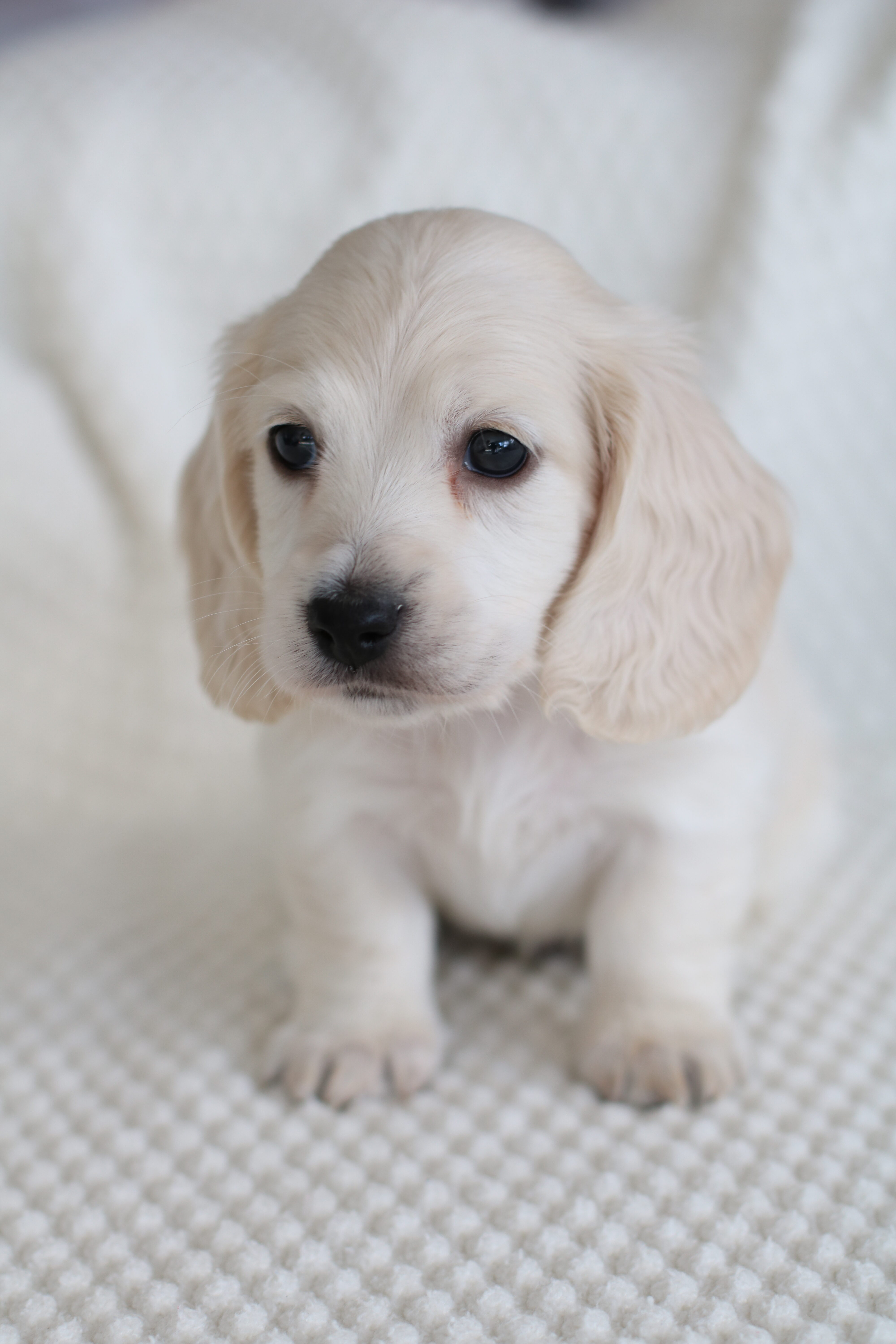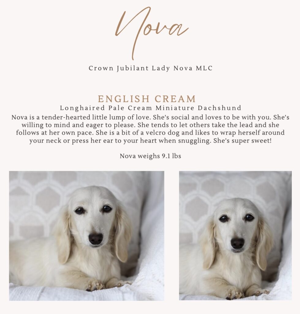 Nova & Princeton had a litter of five English cream longhaired miniature dachshunds – two girls and three boys on January 23, 2026. One little boy is are currently available. Puppies will be 8 weeks old and ready for pickup March 20, 2026.