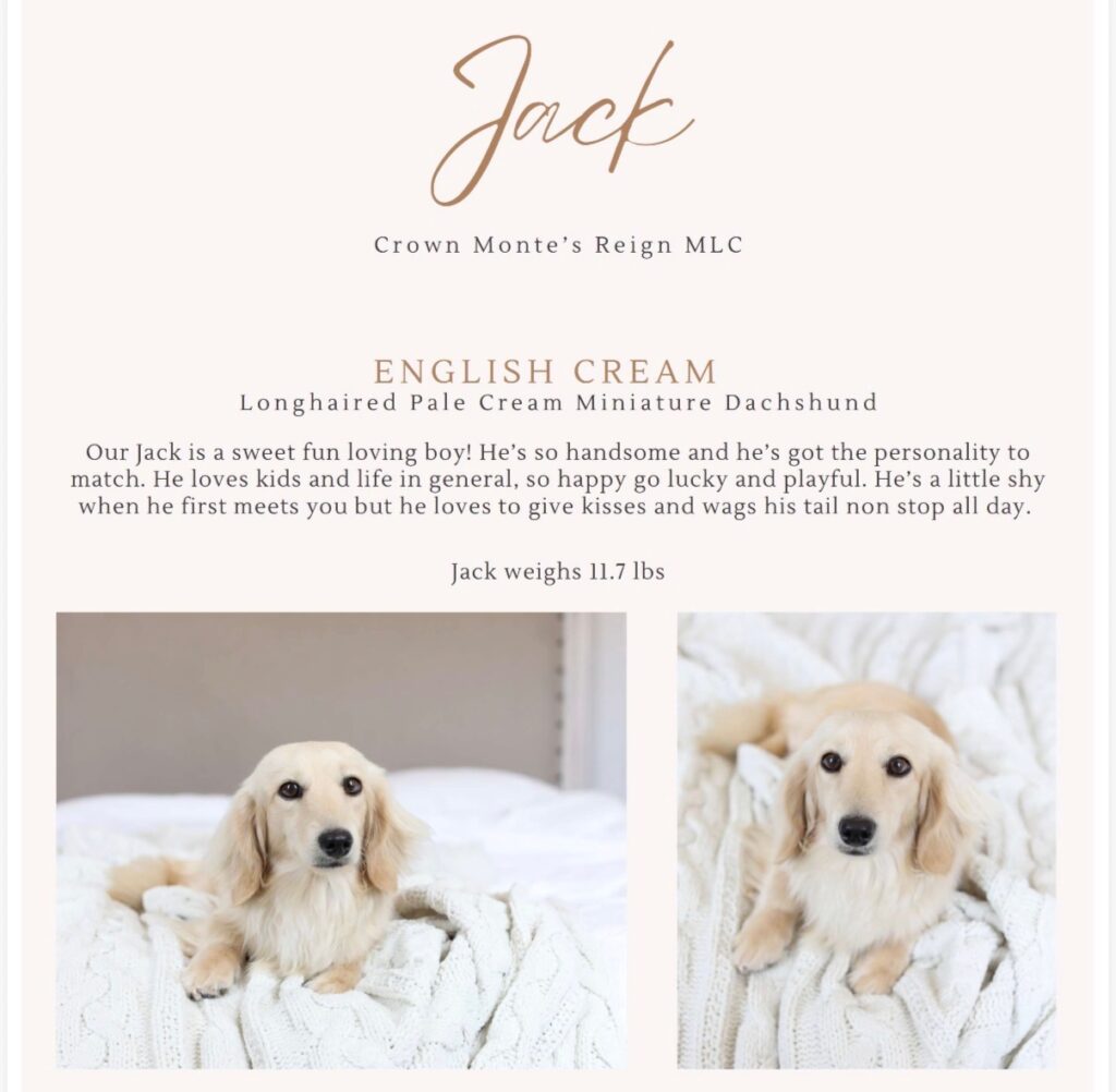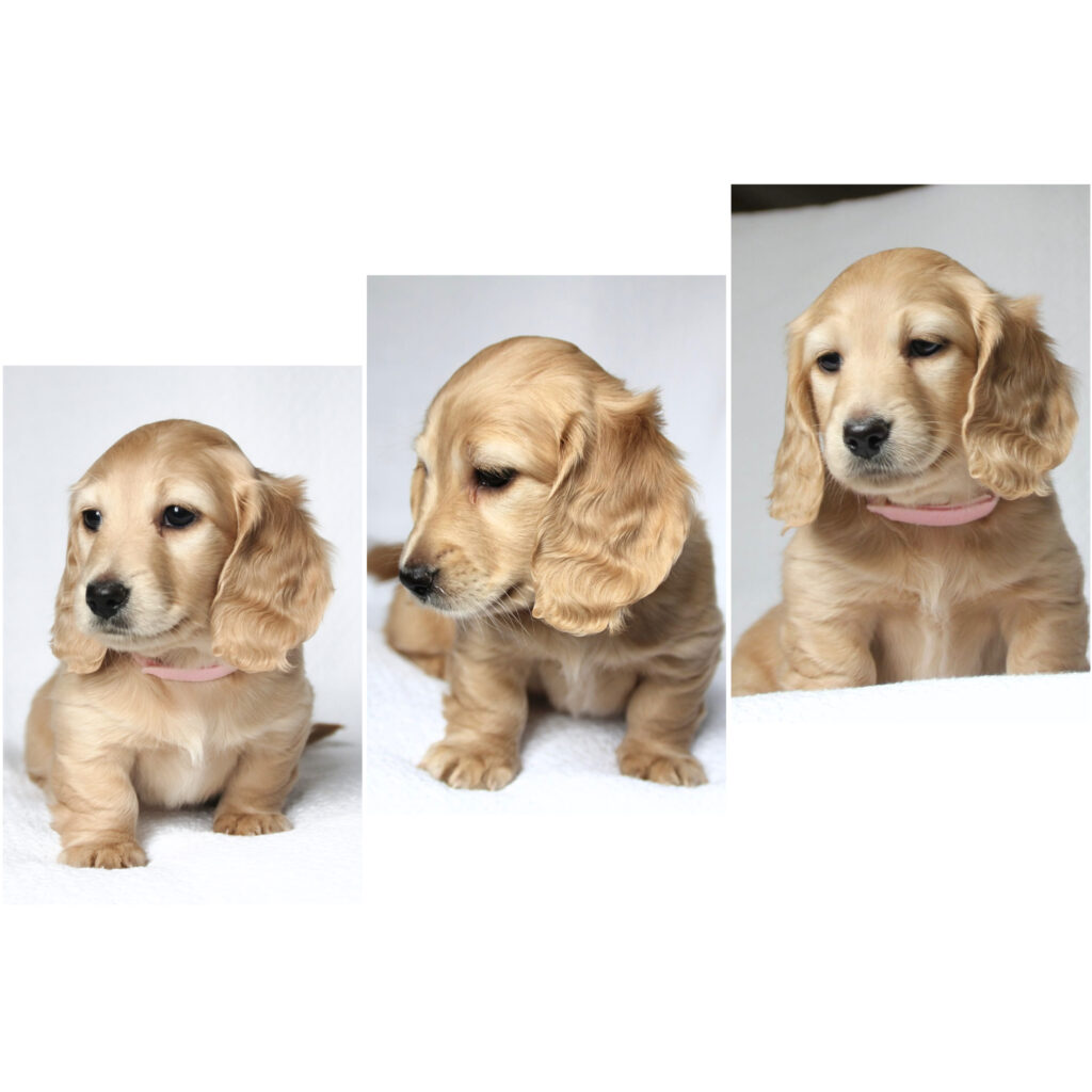 She's a longhaired English cream longhaired miniature dachshund. If you're looking for mini golden vibes in your new best friend, Daisy is all that and more. She has such a sweet mellow temperament and has so much love to give. She is looking to be on the larger side once mature (12 lbs +)