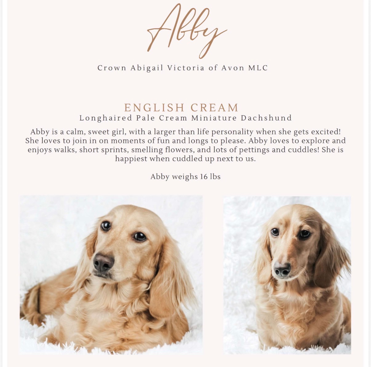 She's a longhaired English cream longhaired miniature dachshund. If you're looking for mini golden vibes in your new best friend, Daisy is all that and more. She has such a sweet mellow temperament and has so much love to give. She is looking to be on the larger side once mature (12 lbs +)