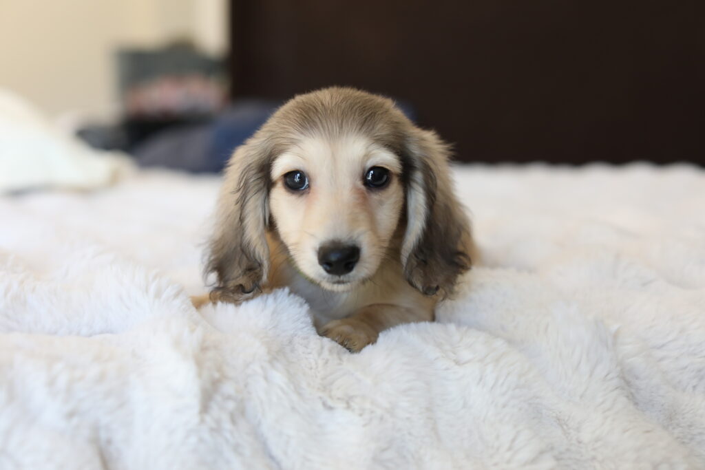 J A C K S O N – Shaded English cream longhaired miniature dachshund (male)