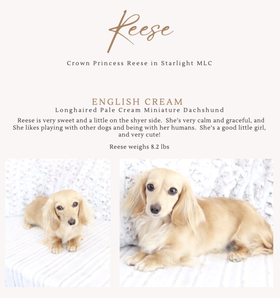 Reese & Topaz had a litter of five English cream longhaired miniature dachshunds – five boys on January 16, 2026. One little boy is currently available. Our cream boys are $4800 pet price. Puppies will be 8 weeks old and ready for pickup March 13, 2026.