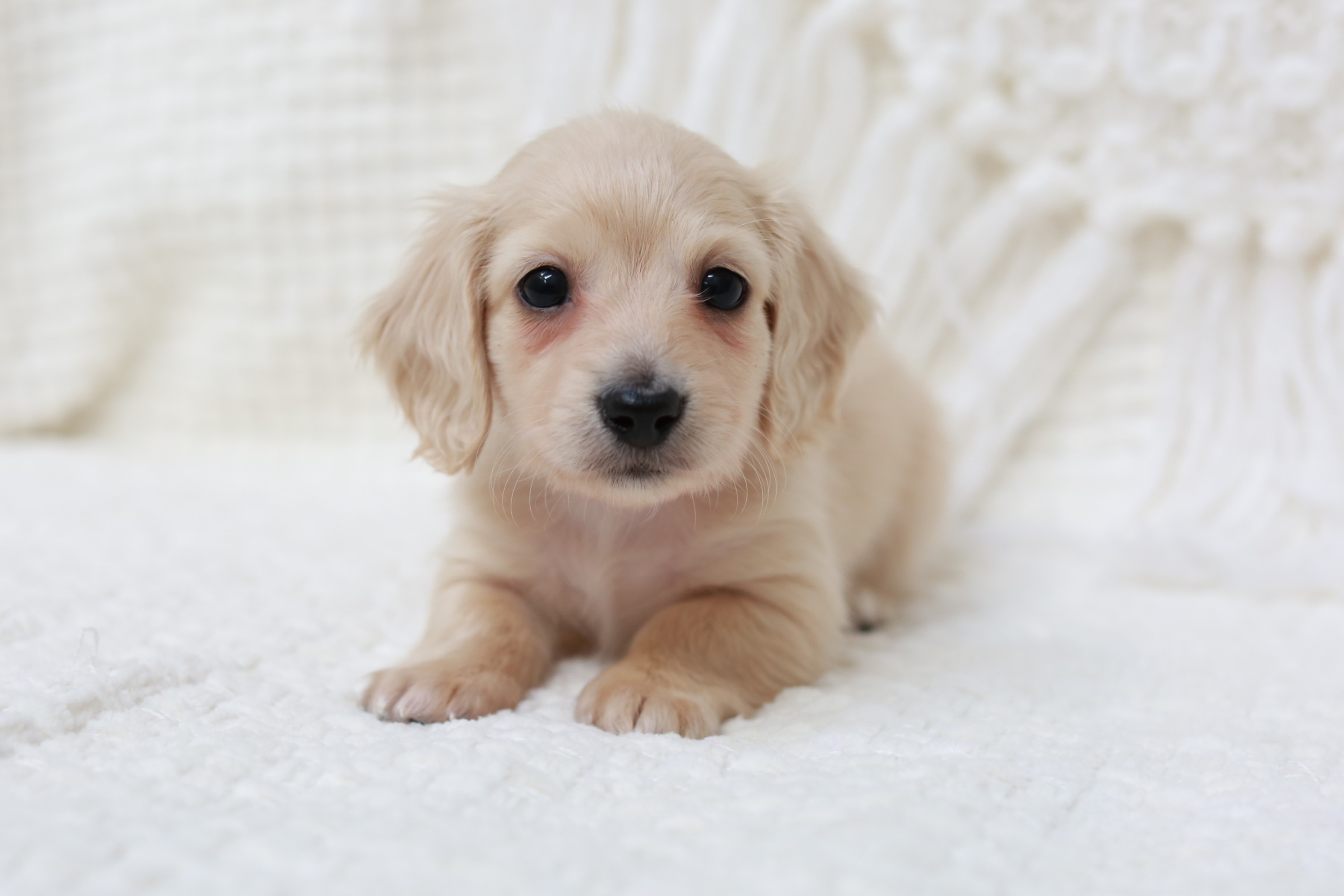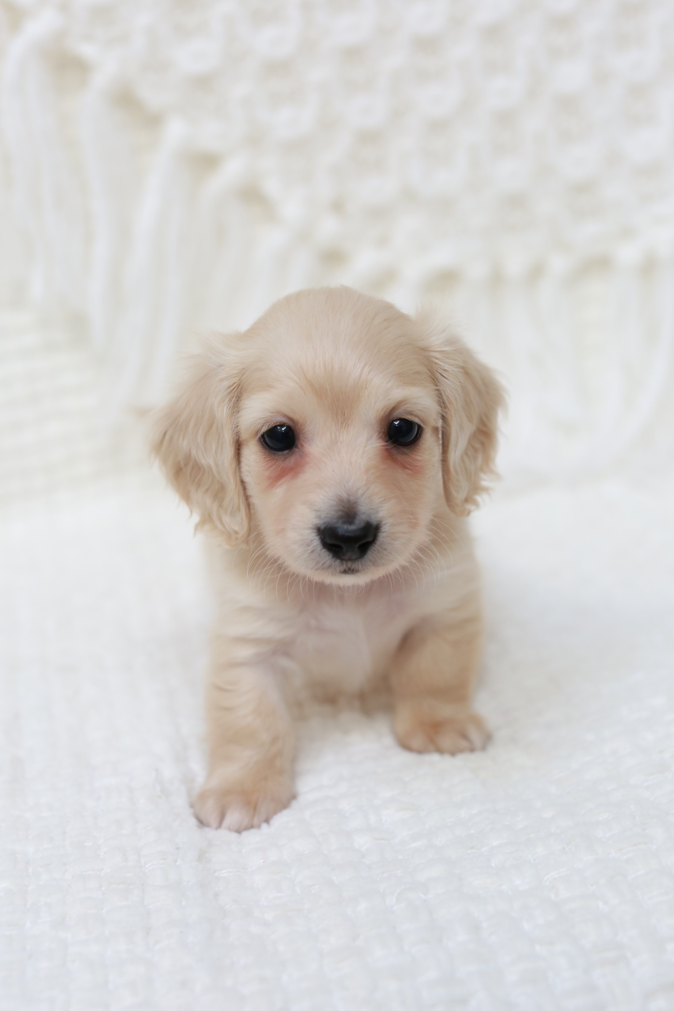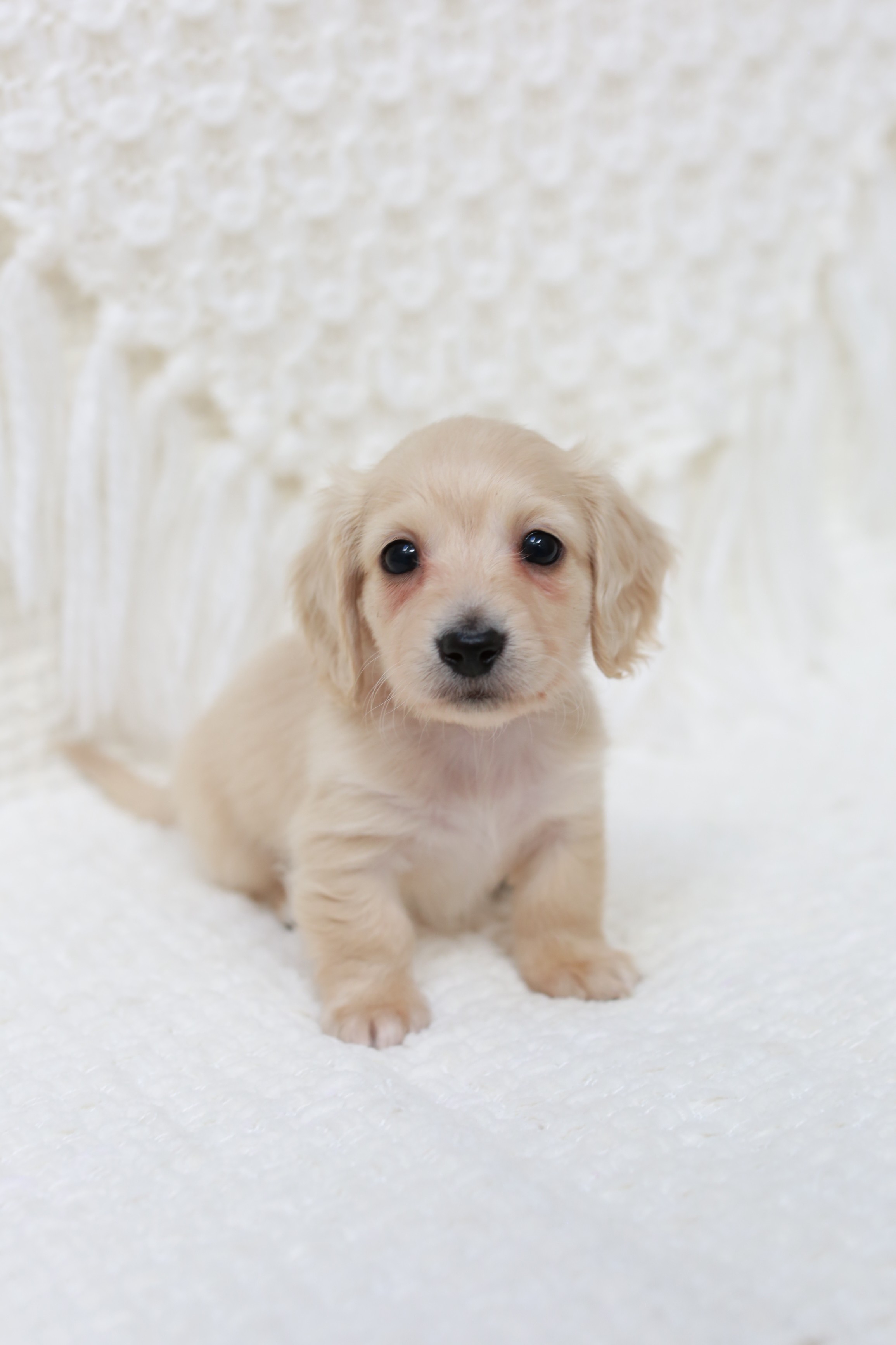 English cream longhaired miniature dachshund – Yellow collar boy (4800 pet price)